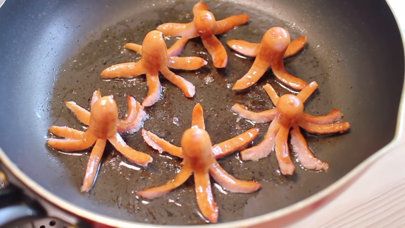 ▼5. 接下來做章魚小香腸,按住香腸,從中間往下切開,再轉角度切開,香腸就能變出很多隻腳了!