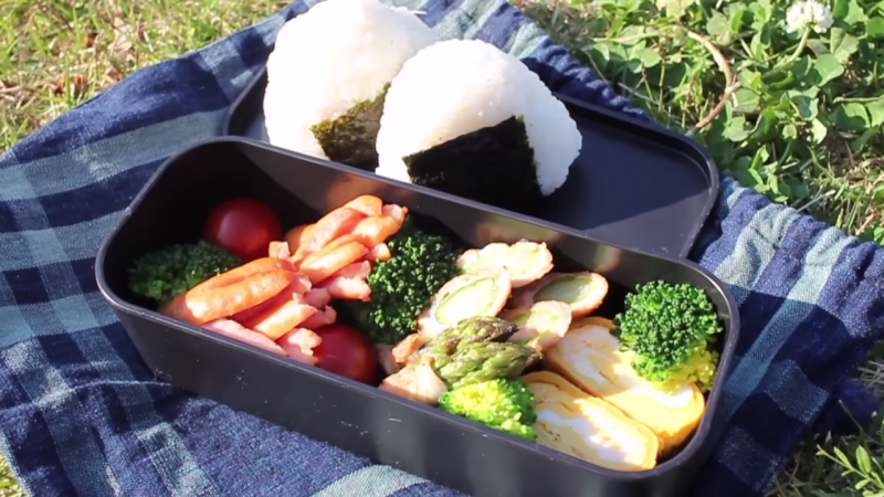 ▼13. 在便當盒內擺盤,可以加上綠花椰、小番茄做點綴,再捏個飯糰,就是日式便當的模樣了!