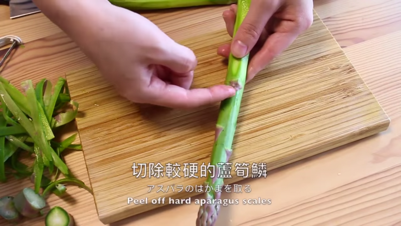 ▼7. 剩下最後的蘆筍豬肉捲,切掉蘆筍下端1公分比較硬的地方,削皮,再去掉蘆筍麟,這樣才會比較好入口。