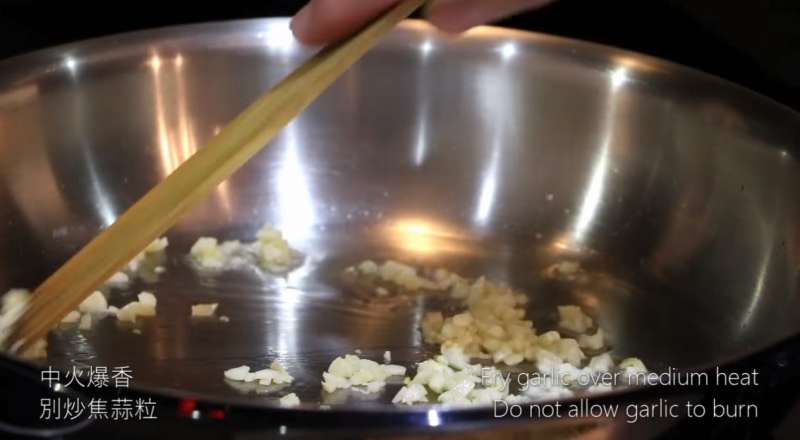 ▼在鍋中放入2湯匙油,加入蒜粒用中火爆香,注意不要炒焦。