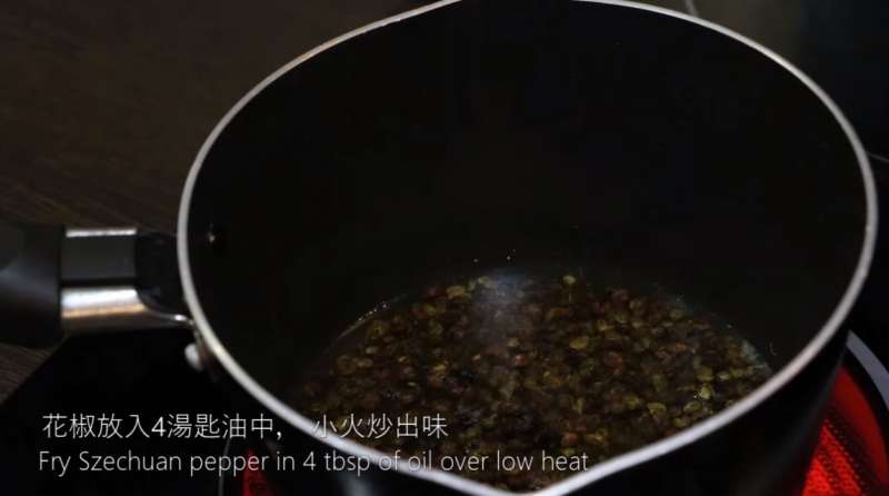 ▼接著在鍋中放入4湯匙油,將花椒放入用小火炒出味道。