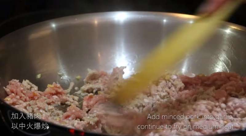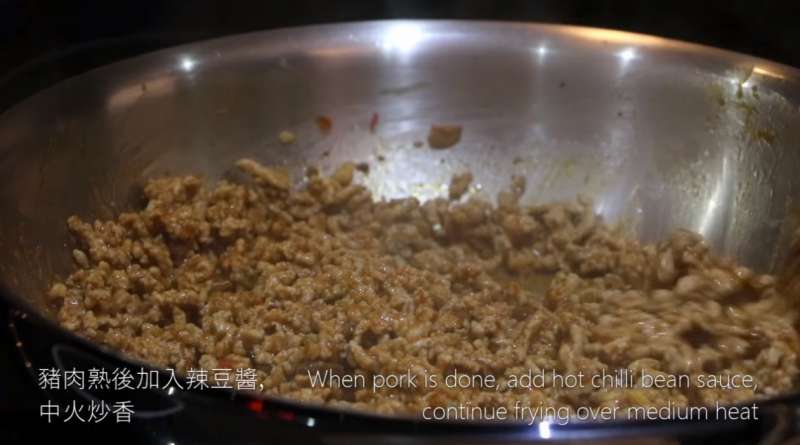 ▼豬肉熟後加入辣豆醬,繼續用中火炒香。