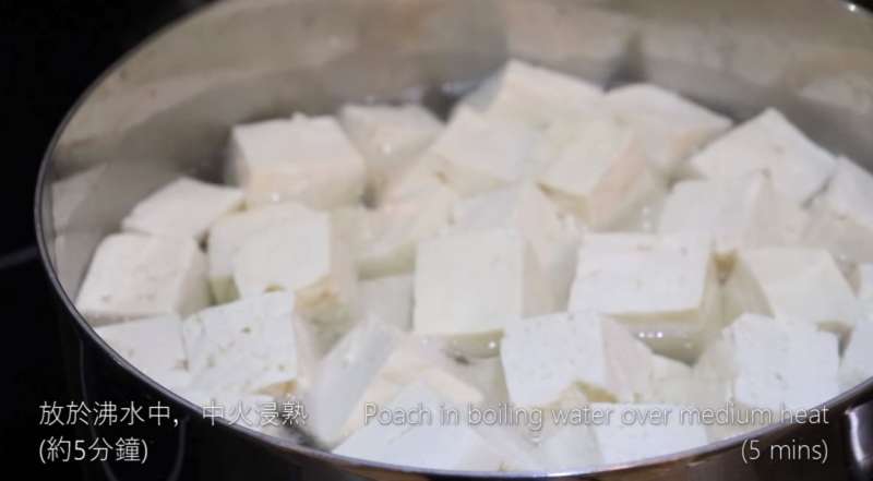 ▼放入沸水中用中火將豆腐浸熟,大概需要約5分鐘,之後撈起備用。