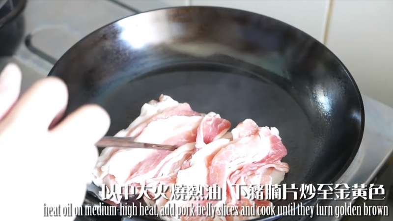 ▼用中大火熱油後,將五花肉放入炒至金黃色,接著撈起備用。