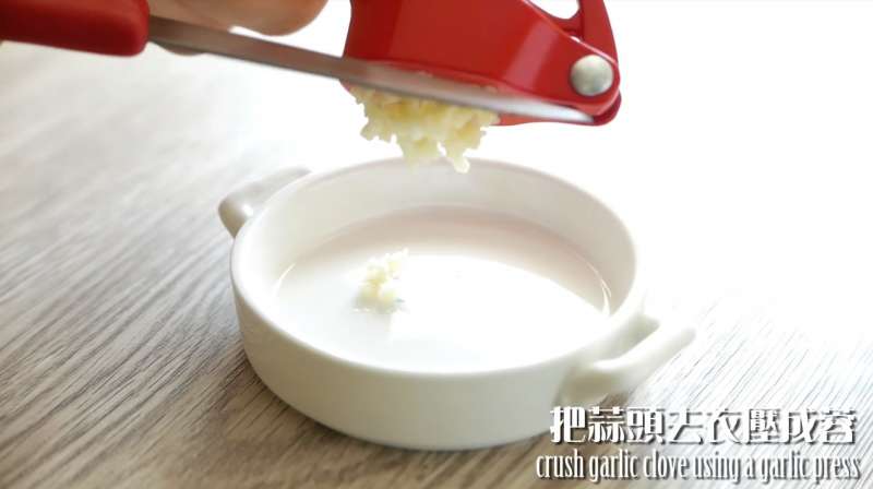 ▼接著將蒜頭去皮後擠成蒜蓉。