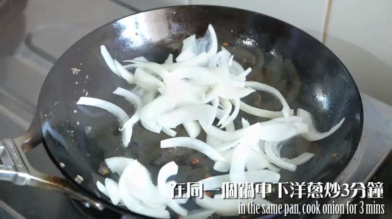 ▼繼續在同一個鍋子內放入洋蔥,炒3分鐘。
