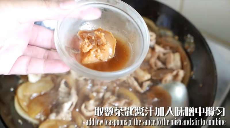 ▼將一些醬汁加入味噌中攪勻,接著倒入鍋中攪拌。