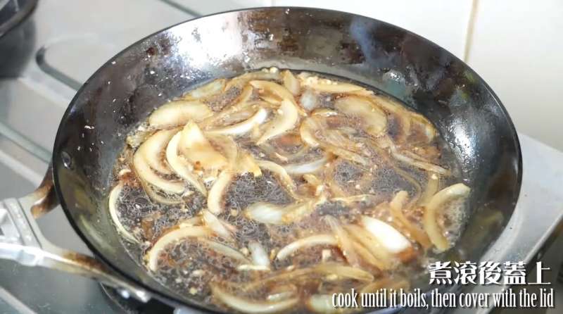 ▼將攪拌好的醬汁倒入煮滾後,轉小火蓋上煮5分鐘。