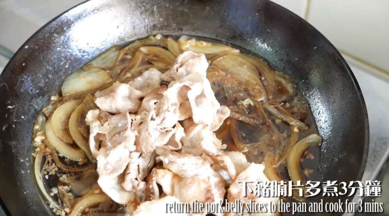 ▼5分鐘後打開蓋子,將五花肉加入炒3分鐘。
