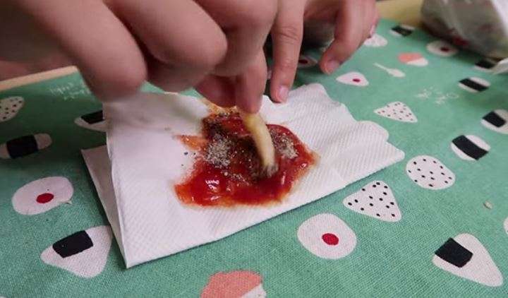 ▼1.薯條+番茄+砂糖+黑胡椒─酸酸甜甜又帶點顆粒的口感,讓薯條跟醬料做了完美結合!