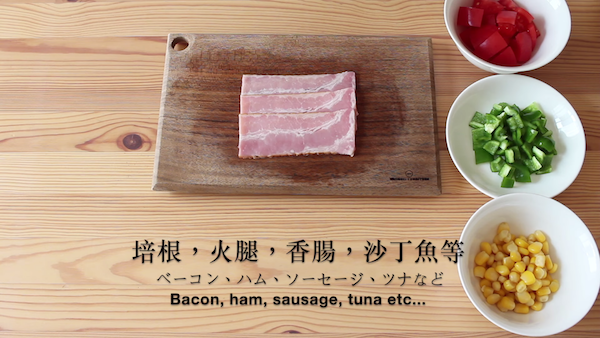 ▼3. 處理培根、火腿、香腸或沙丁魚,看你準備的是什麼料。切成小塊備用。
