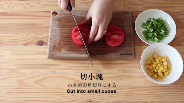 ▼2. 番茄剖半,去除蒂頭,切成小塊備用。