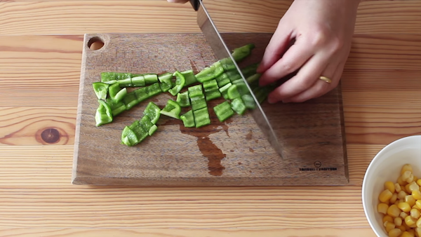 ▼1. 從玉米罐頭挖出一些玉米備用,青椒去除蒂頭、種籽,切丁備用。