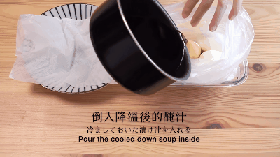 ▼5. 去完殼後把雞蛋用廚房紙巾擦乾,放到乾淨的袋子裡,然後倒入剛剛煮好的醃汁。蒜頭可以一起丟下去,也能拿出來配飯吃喔!