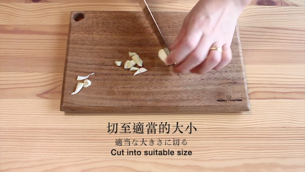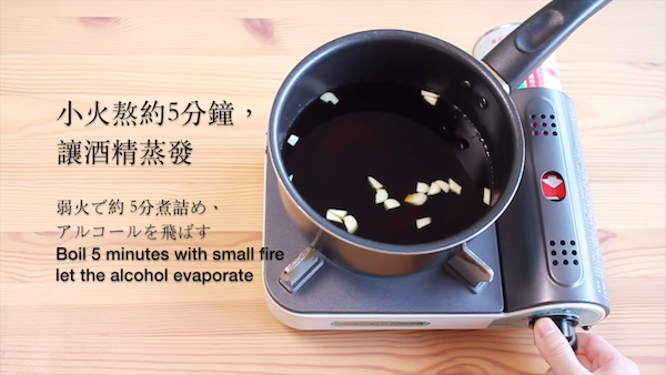 ▼2. 把大蒜放入小鍋子內,加入水、醬油、料理酒、味醂、砂糖等所有材料,小火熬煮5分鐘至酒精蒸發,靜置放涼。