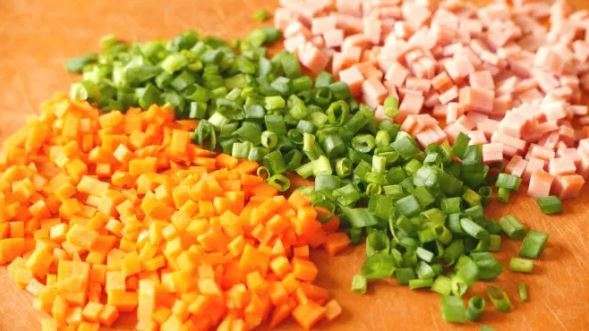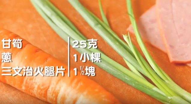 ▼首先準備的食材有:甘筍(25克)、蔥、火腿片、雞蛋(4顆)、白醋(1/4茶匙)、鹽(1/3茶匙)、美乃滋、茄汁