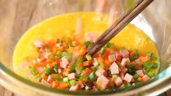 ▼把白醋和鹽加入雞蛋中打勻後,加入甘筍、蔥和火腿拌勻