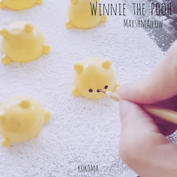 ▼5. 為小熊維尼畫上TsumTsum版的五官,最後撒上玉米粉拍一拍就完成了!