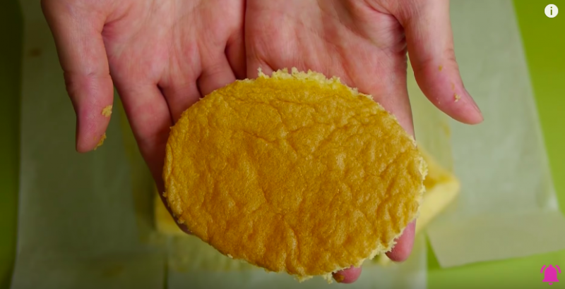 ▼切一塊橢圓形的海綿蛋糕,當作拉拉熊的臉。