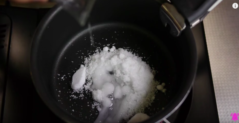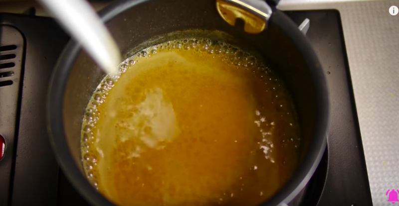 ▼將80g糖、30cc水放入鍋中,中火加熱,變成棕色後關火;