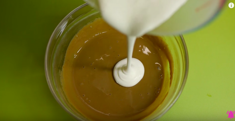 ▼將打發好的淡奶油放入混合物中,攪拌均勻;