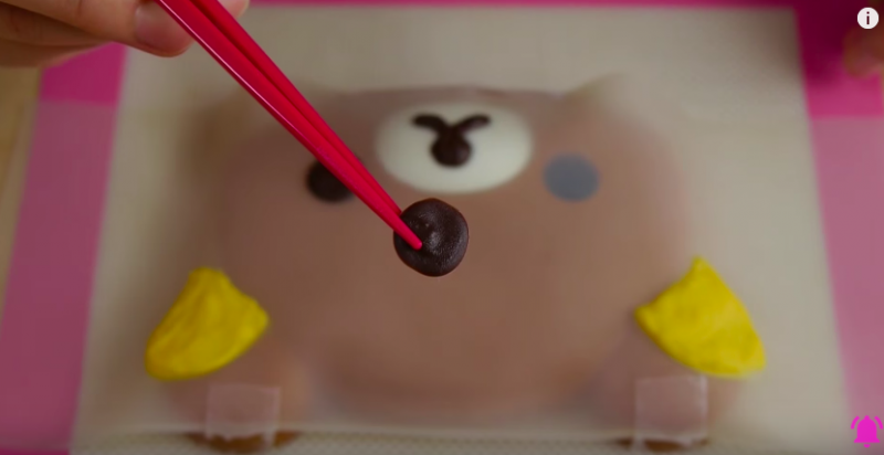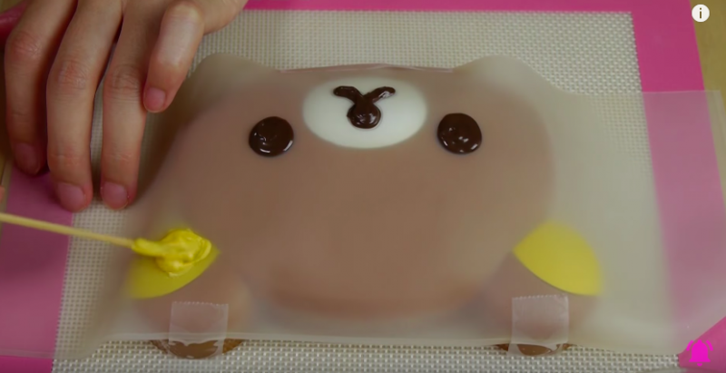▼將矽膠墊蓋在便當盒上,順著拉拉熊的五官塗上不同顏色的巧克力;