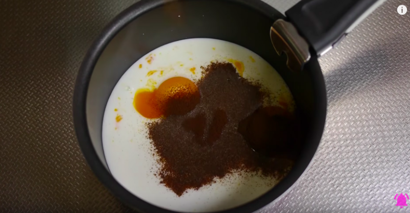 ▼將2個蛋黃放入鍋中,加入100cc鮮奶、30g糖、2茶匙即溶咖啡,小火加熱,攪拌均勻,混合物變黏稠後關火;