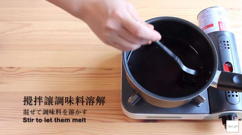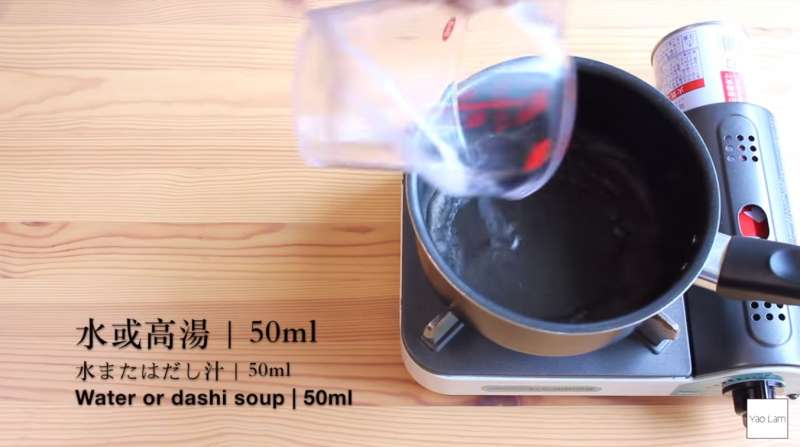 ▼在鍋子中加入水或高湯50ml、米醋60ml、味醂30ml、醬油60ml,開火後攪勻。