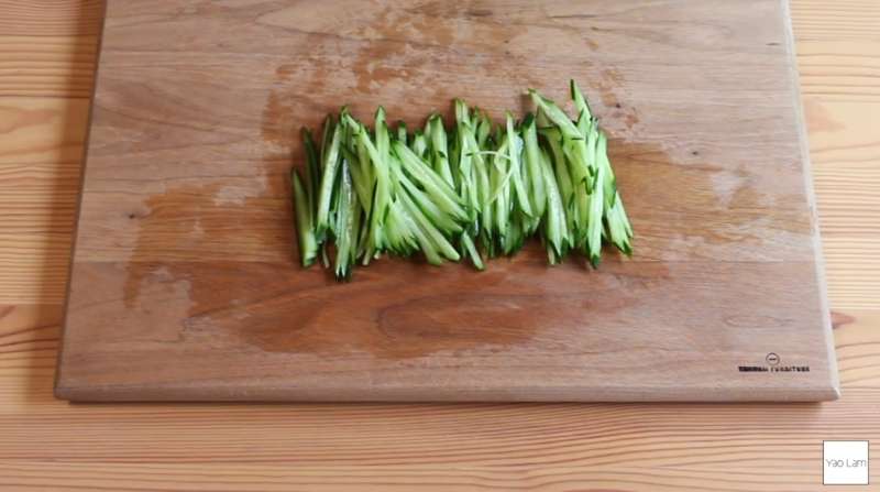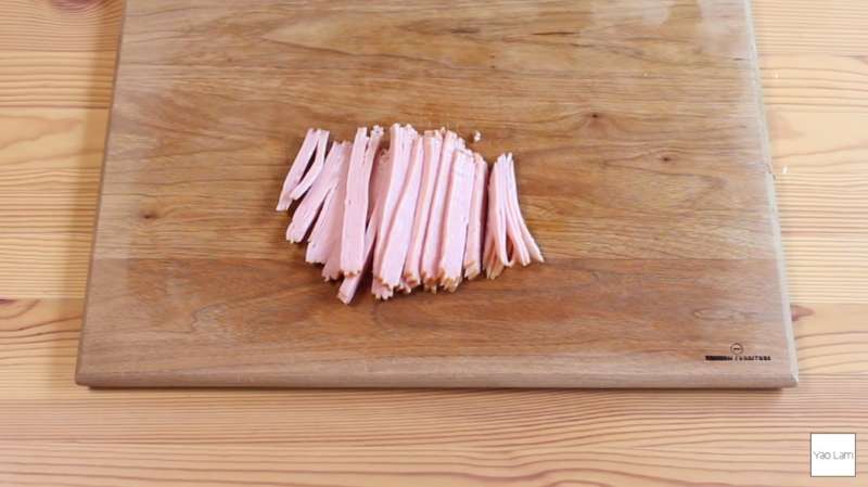 ▼將小黃瓜、火腿都切成絲備用。