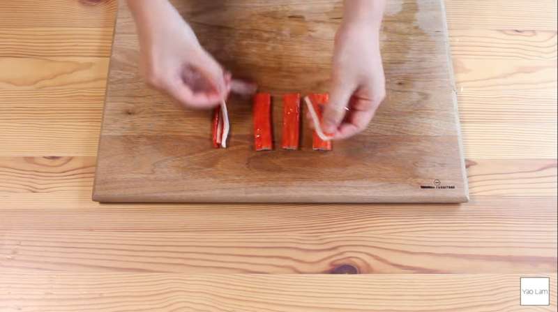 ▼用手將蟹柳條撕成條狀。