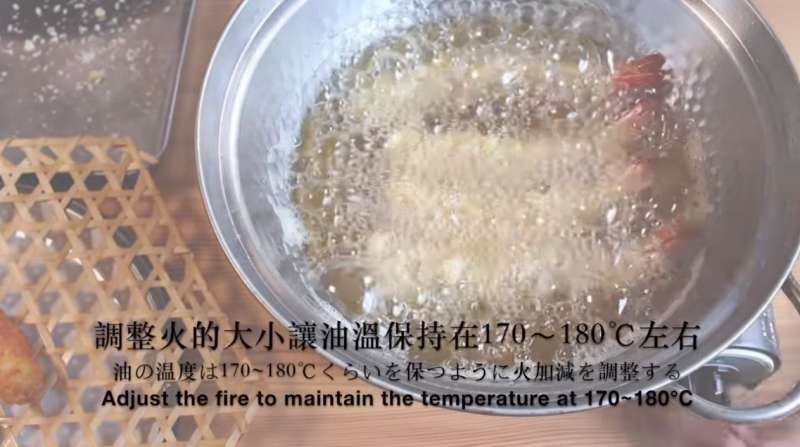 ▼在炸蝦時記得調整火的大小,讓油溫保持在170至180度之間。