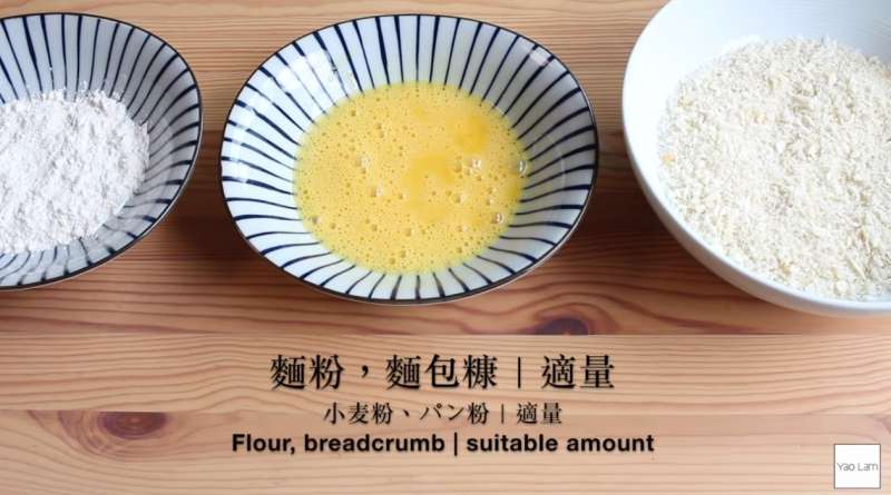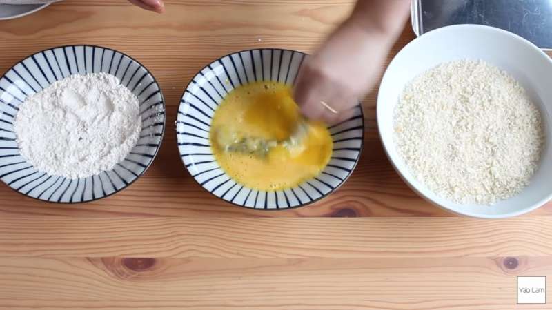 ▼準備一顆蛋將其攪勻,將蛋放在麵粉和麵包粉的中間。