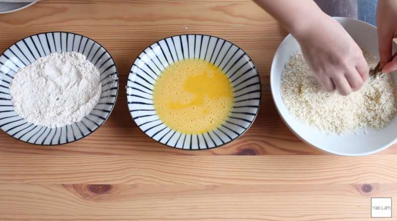 ▼開始將蝦子裹粉,依序是麵粉、蛋黃、麵包粉。