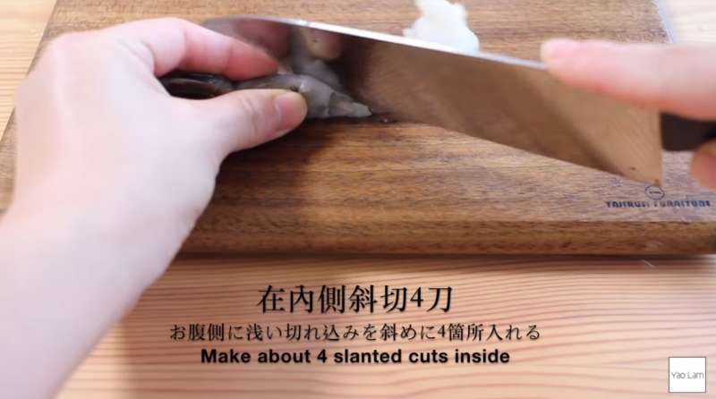 ▼在蝦子的內側斜切4刀,接著將蝦背往後折。