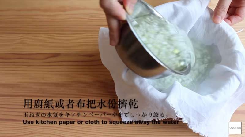 ▼利用廚房紙或者布將洋蔥的水份擠乾後備用。