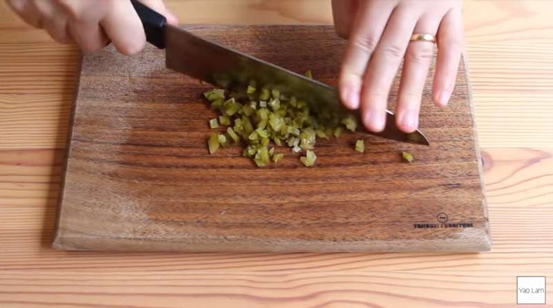 ▼脆瓜醬菜1條,同樣切成丁備用。