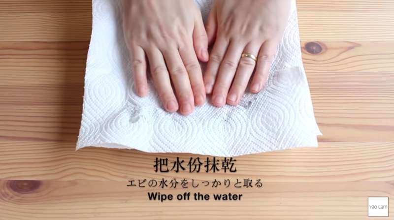 ▼處理完後,用紙巾將蝦子的水份吸乾,防止在炸的時候讓油濺起來。