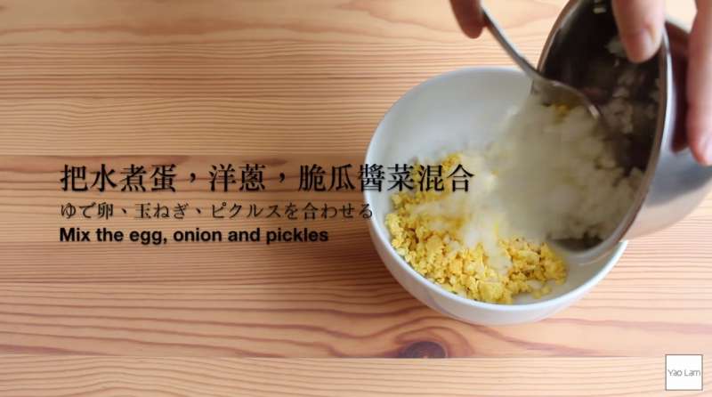 ▼之後將壓碎的水煮蛋、洋蔥、脆瓜醬菜都混在,加入美乃滋4大匙和檸檬汁少許,一起攪拌。