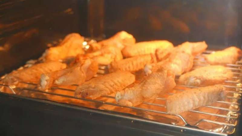 ▼把雞翅放到網架上,放入己預熱至120℃的焗爐,置於中低層烤15分鐘