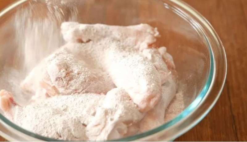▼把雞翅洗淨後以廚紙印乾,把拌好的粉末加到雞翅中,用手拌勻