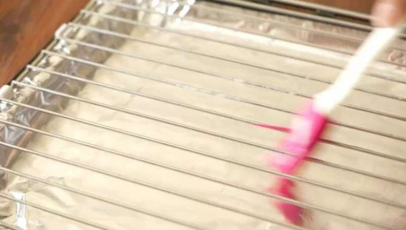 ▼烤盤上鋪上錫紙,放上網架後,在網架上抹油