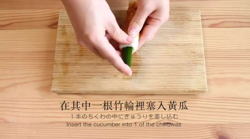 ▼接下來準備兩條竹輪,在其中一根竹輪中塞入小黃瓜。