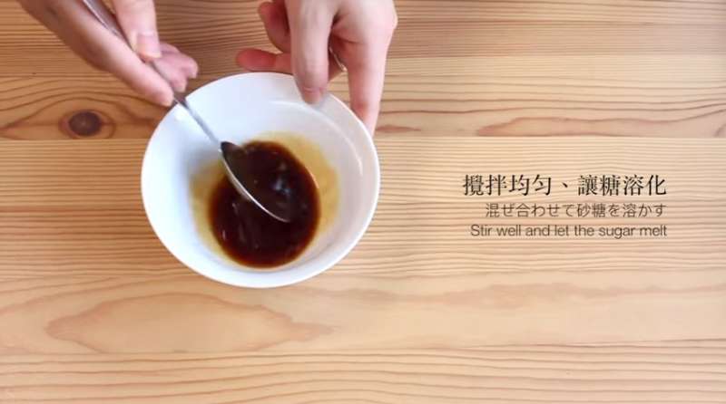 ▼接著準備調味醬料,在碗中放入糖1小匙、味醂1大匙、醬油1大匙後均勻攪拌,讓糖可以溶化。
