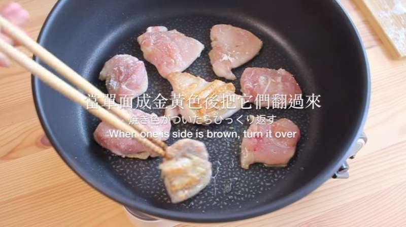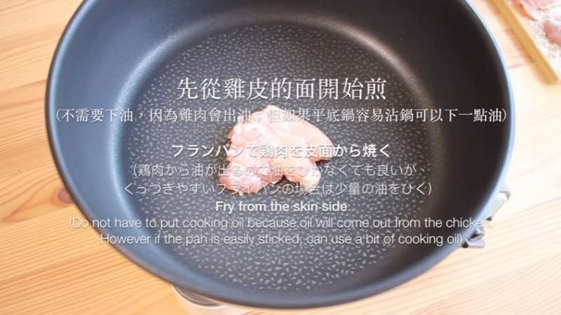▼開始煎雞肉了!記得先從雞皮面開始煎,因為雞皮會分泌出油。