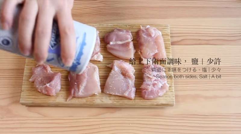 ▼開始為雞肉進行調味,首先撒上鹽少許、胡椒粉少許、麵粉適量,記得上下兩面都要進行。