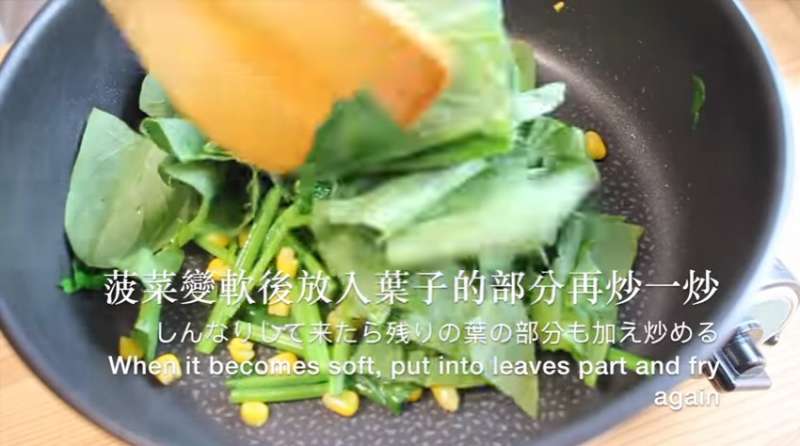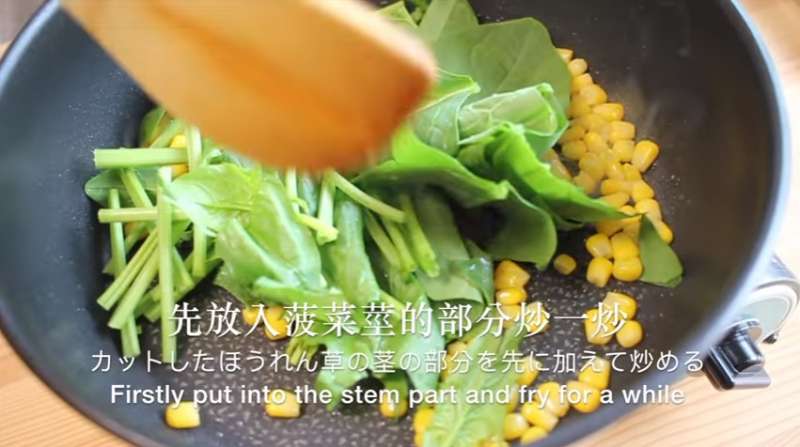 ▼將菠菜(約3束)切成容易吃的大小後,先將莖的部分和3大匙的玉米粒放下去炒一下。