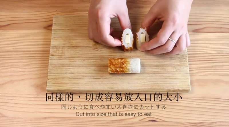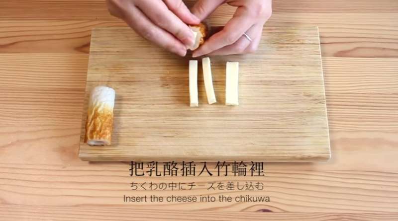 ▼接下來準備一塊乳酪,切成條狀後塞進另一條竹輪內。