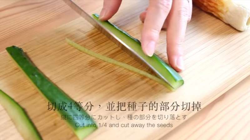 ▼首先準備一條小黃瓜,切去頭尾之後切成4等份,並將中間種子的部分切除。