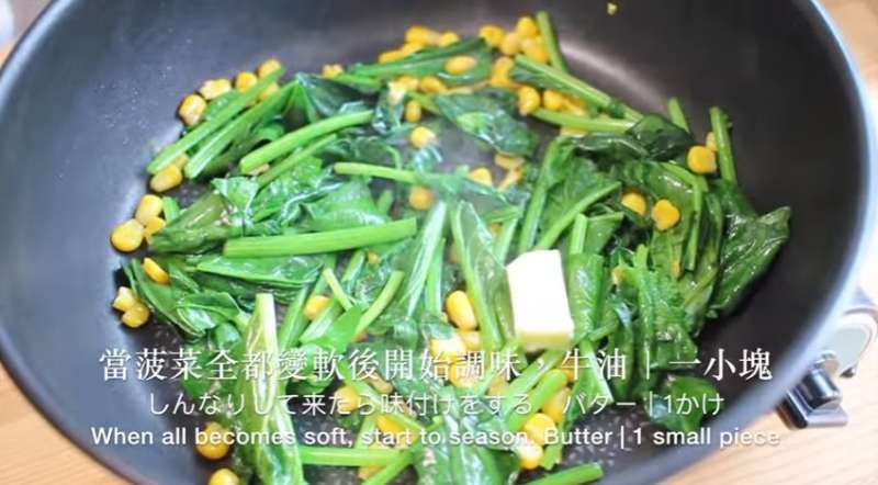 ▼菠菜全都開始變軟後,就可以加入牛油1小塊、鹽和胡椒粉少許來進行調味。