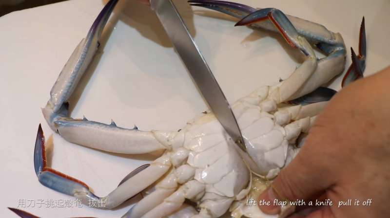 ▼用刀子將蟹殼從腹部處挑開。